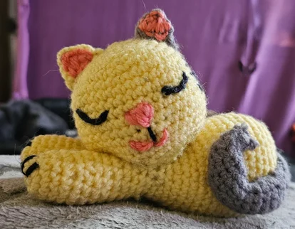 Hier ist zum größten Teik Baumwollgarn benutzt worden und Mund, Nase und Schnurrhaare, so wie Augen sind Aufgestickt.